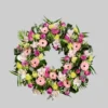 Arreglo floral circular elaborado con una variedad de flores frescas, elegido y diseñado específicamente para rendir homenaje y mostrar respeto durante servicios funerarios. Estas coronas suelen ser elaboradas con flores de temporada y pueden incluir una mezcla de colores y tipos de flores, dependiendo de las preferencias y gustos del difunto y sus seres queridos.
